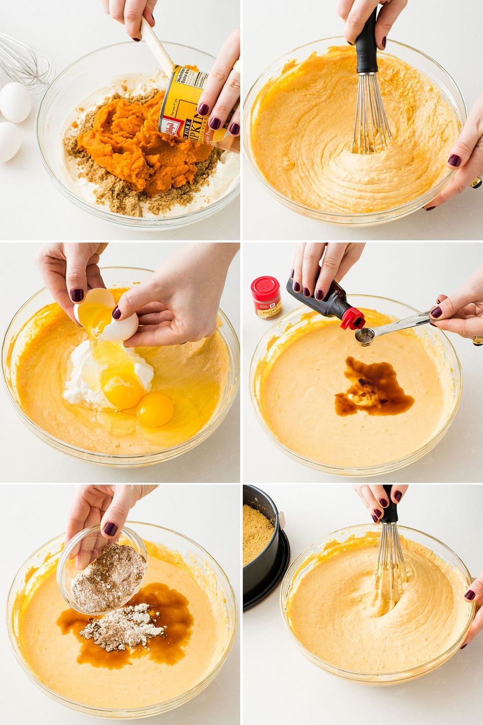 - In a large bowl, whisk together the cream cheese, brown sugar, pumpkin puree, sour cream, eggs, vanilla, flour and pumpkin pie spice.