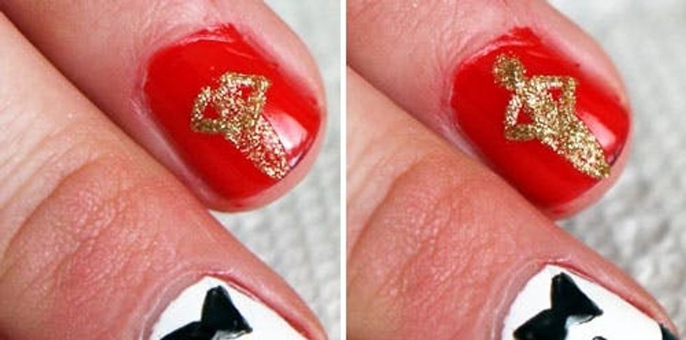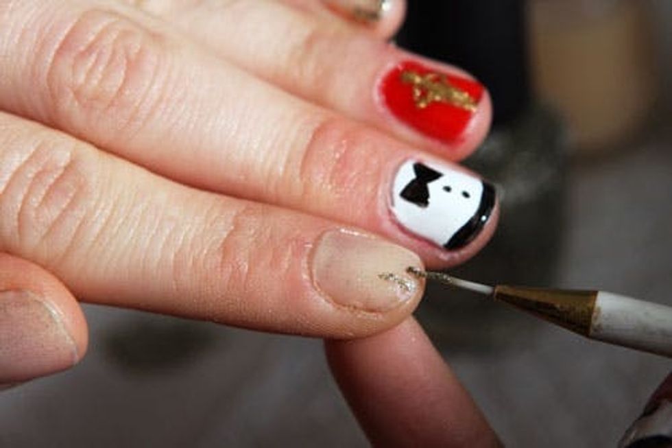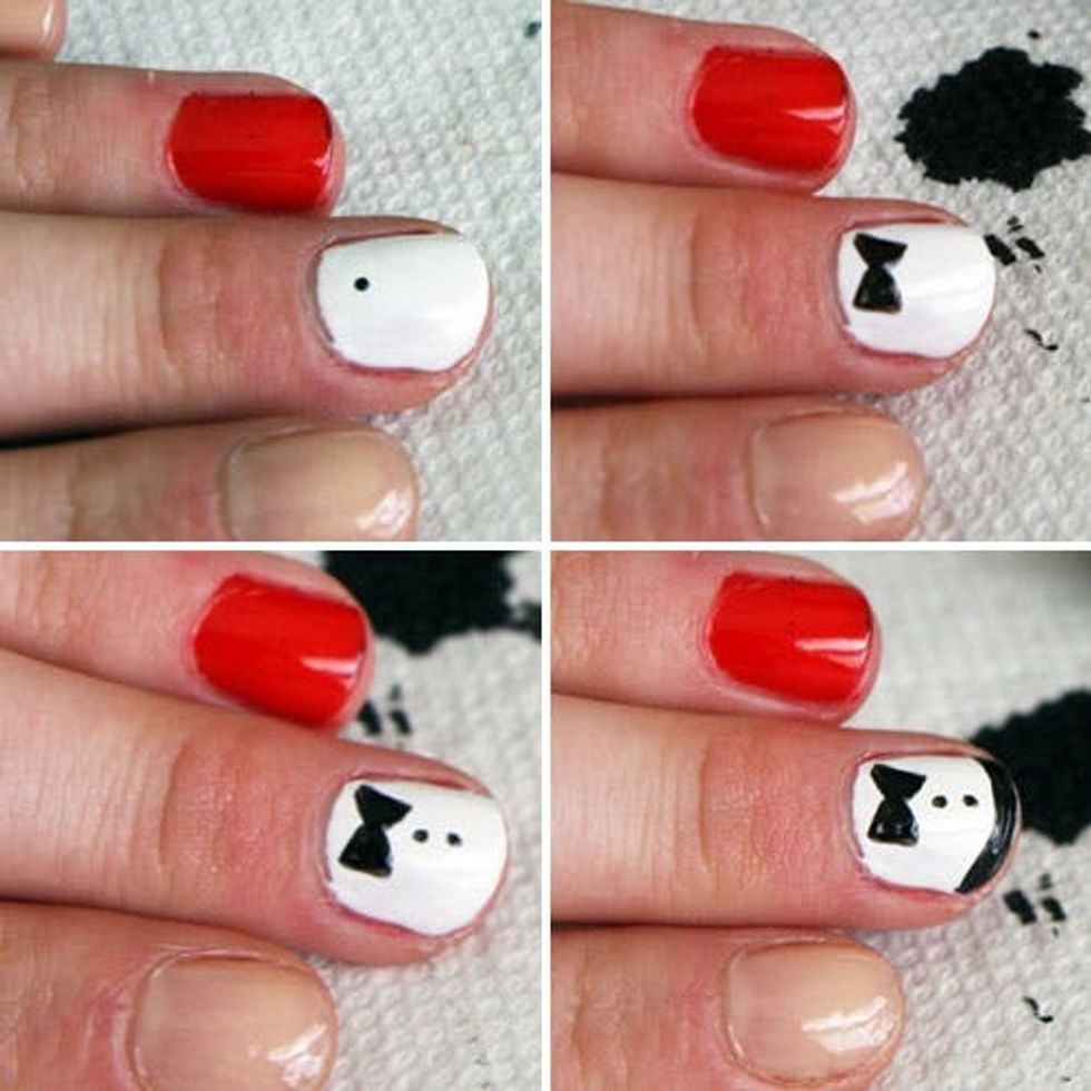Then using the same dotting technique, outline a triangle coming off the dot on both sides to create your bow tie. Dot the buttons, and then paint the tip of your tuxedo nail black to polish off the look. (That’s right, polish off the look!)