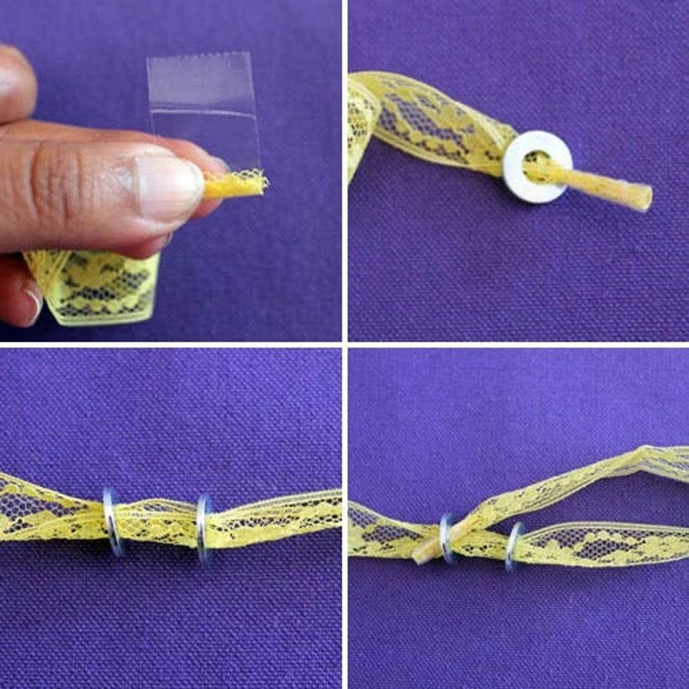 Use tape to create a needle or shoelace end on one end of your trim. Loop your first washer through, then the second one.