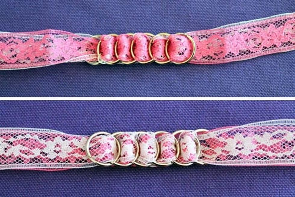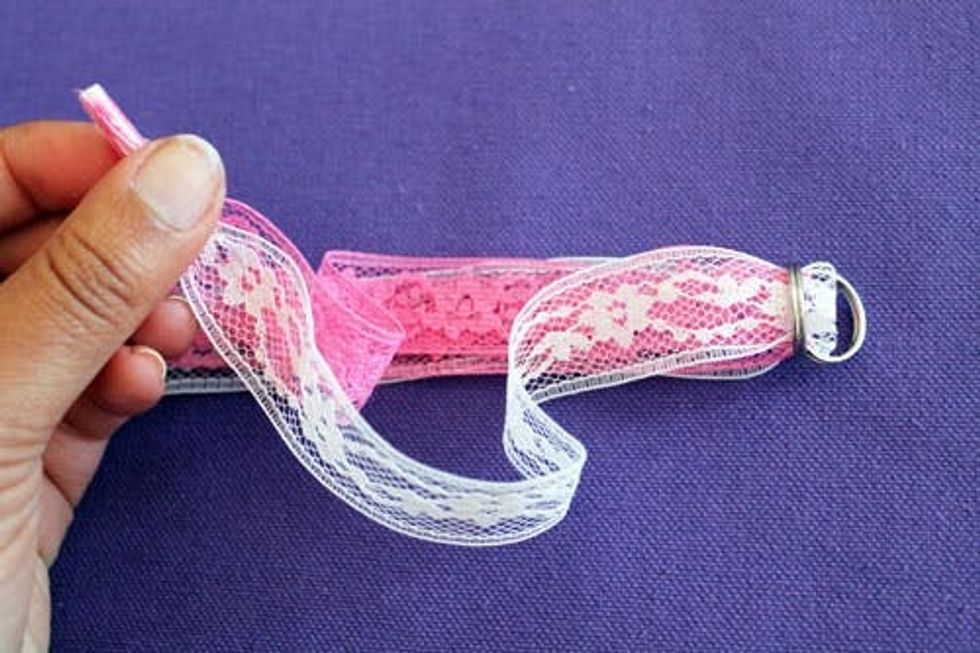 For the second bracelet, we used two pieces of lace trim and some extra small key rings leftover from our DIY Camera Strap.