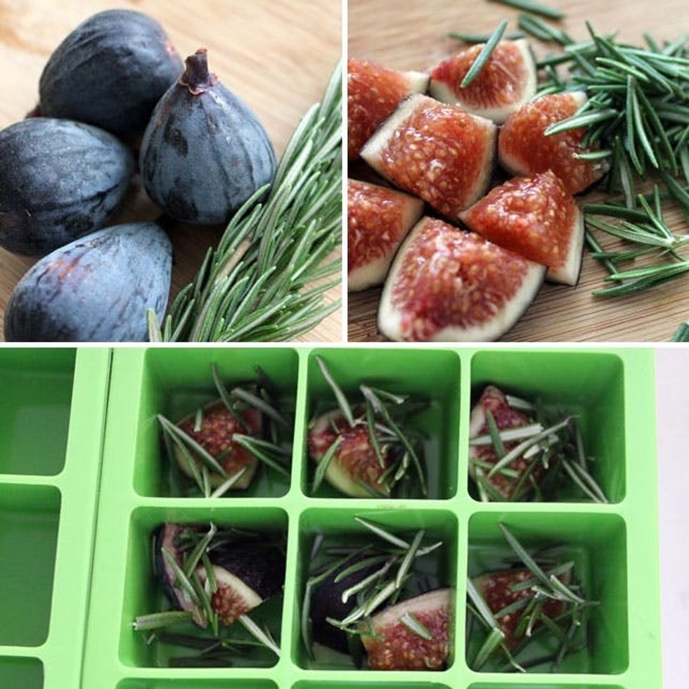 Quarter your figs and pull of sprigs of rosemary off their stems. Place a little bit of everything in your ice cube tray.