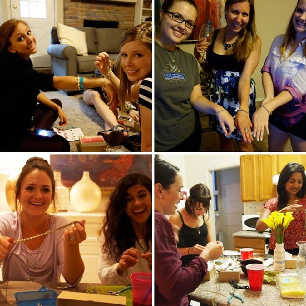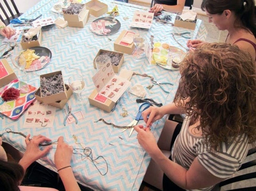 This month, party guests received all the makings for two smokin’ statement bracelets: chains, rhinestones, and embroidery floss.