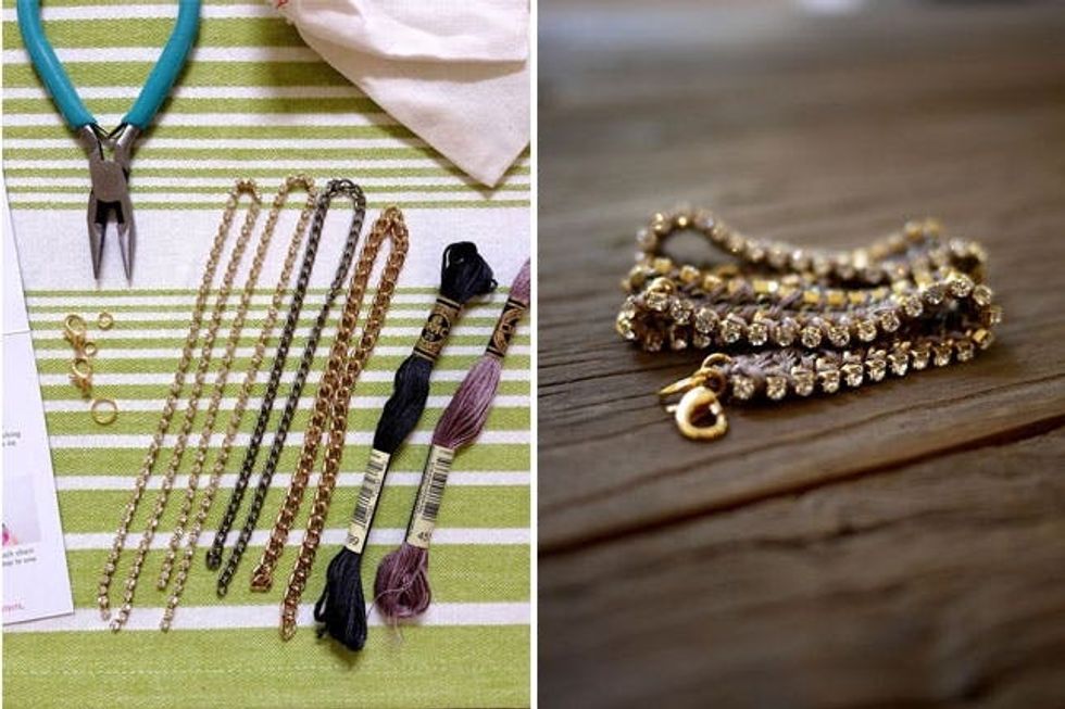 The first bracelet was a double rhinestone bracelet using rhinestone chain and embroidery floss, and the second was a chunkier wrap bracelet. Bling it on!