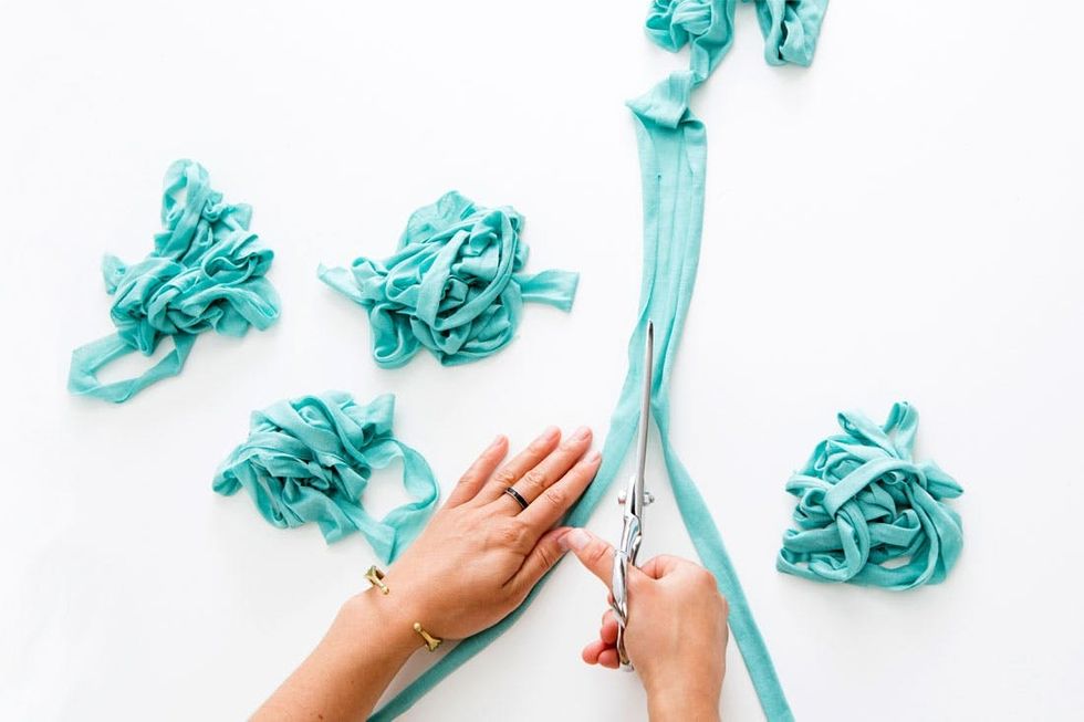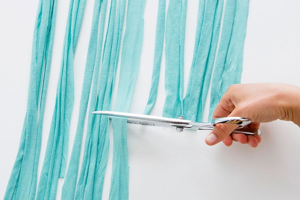 First things first, you need to cut some long strips of fabric. By long we don’t mean a yard, we mean three or four, or maybe even five yards. Whoa! Each piece will be folded in half and then knotted, so the length will decrease substantially.
