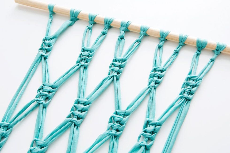 4. Make a row of square knots a few inches below your initial row of basic knots (read below for step-by-step square knot instructions!). Then right underneath, add a second row of square knots using the same fabric strips, creating a double-square knot pattern.