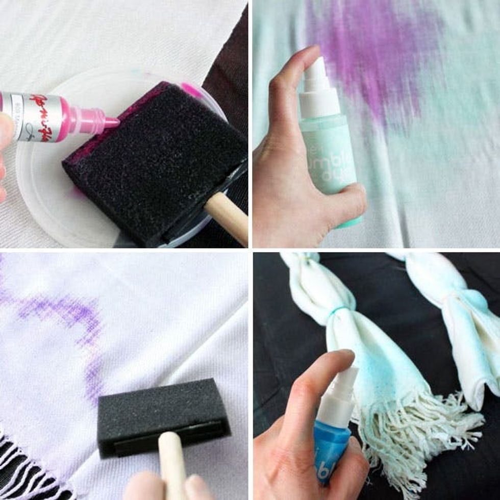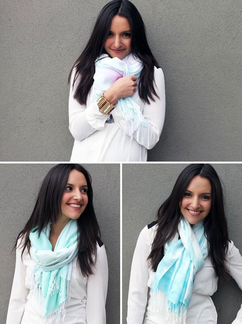 Here are a few ways that we got creative with our different dyes. You can create Ikat, ombre, chevron, and striped scarves – or you can totally improvise and just see what happens. Perhaps tap into your former summer camp self for a little tie dye action? For more detailed steps on each of these patterns, head to our post on Dyed Scarves.