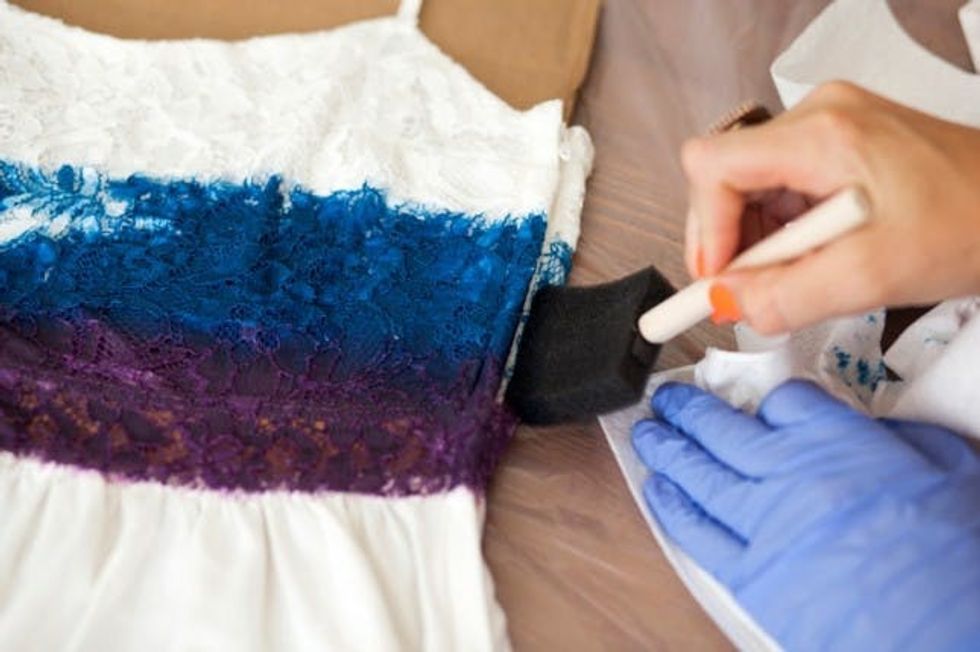Lay your dress out on a drop cloth and insert a piece of cardboard into the dress. This will ensure that your dye doesn’t bleed through to the back – though you’ll be dyeing the back as well.