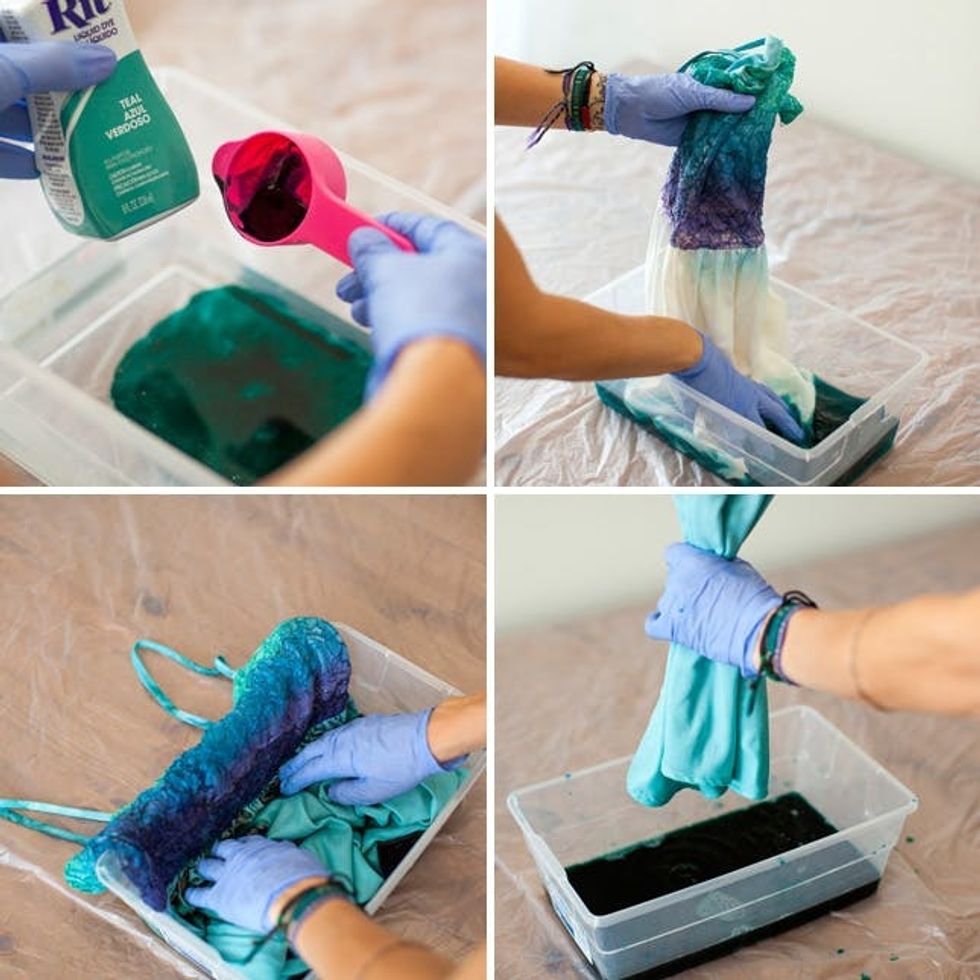 Mix 1 part dye with 6 parts water and dunk the whole skirt part into the dye. Squeeze out excess dye.
