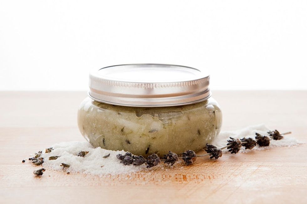 Remove the lavender buds from the sprigs just like you would with herbs like thyme and rosemary, then boost the calming aroma by adding drops of lavender essential oil to your sea salt scrub. Pour in the grapeseed oil and gently mix to combine.