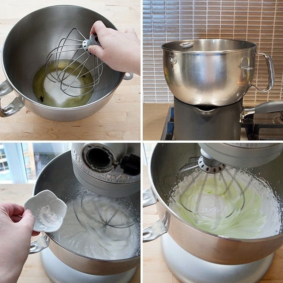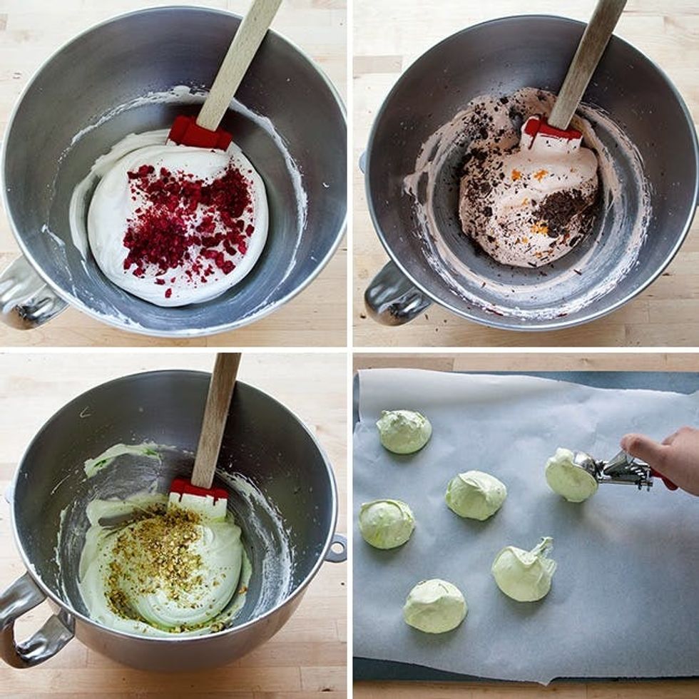 Time to whip up your meringue! Whisk together egg whites, sugar, and vanilla, dissolve over a double boiler, then beat on high speed until your peaks are stiff and glossy. Half way through though, drop in that cream of tartar and salt, then about a minute before its done, add a few drops of food coloring to get a light pastel hue. We used pink for our raspberry meringues, orange for our orange-chocolate batch, and green for our pistachio variety—the colors are both super pretty and a cute visual cue relating to what your about to bite into.