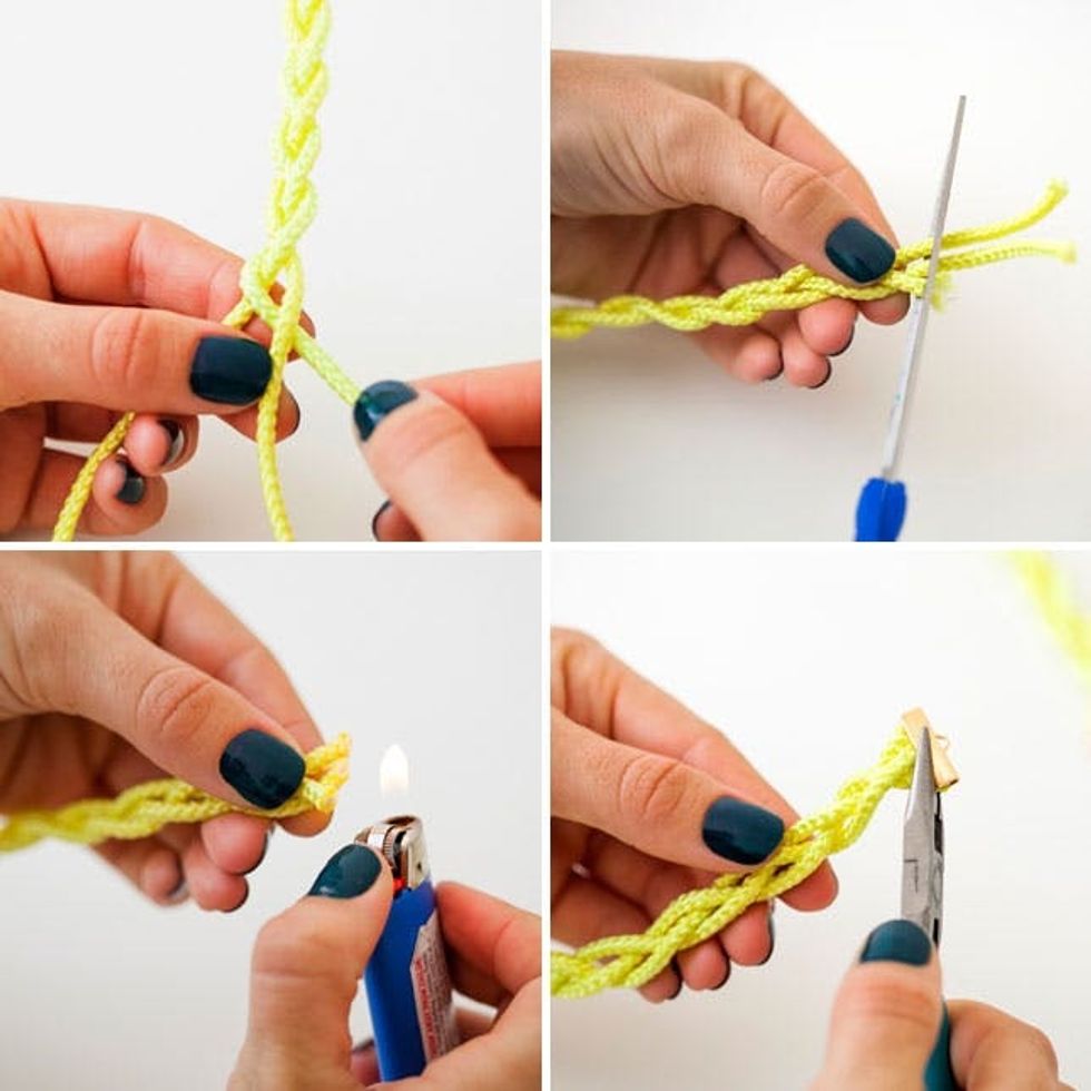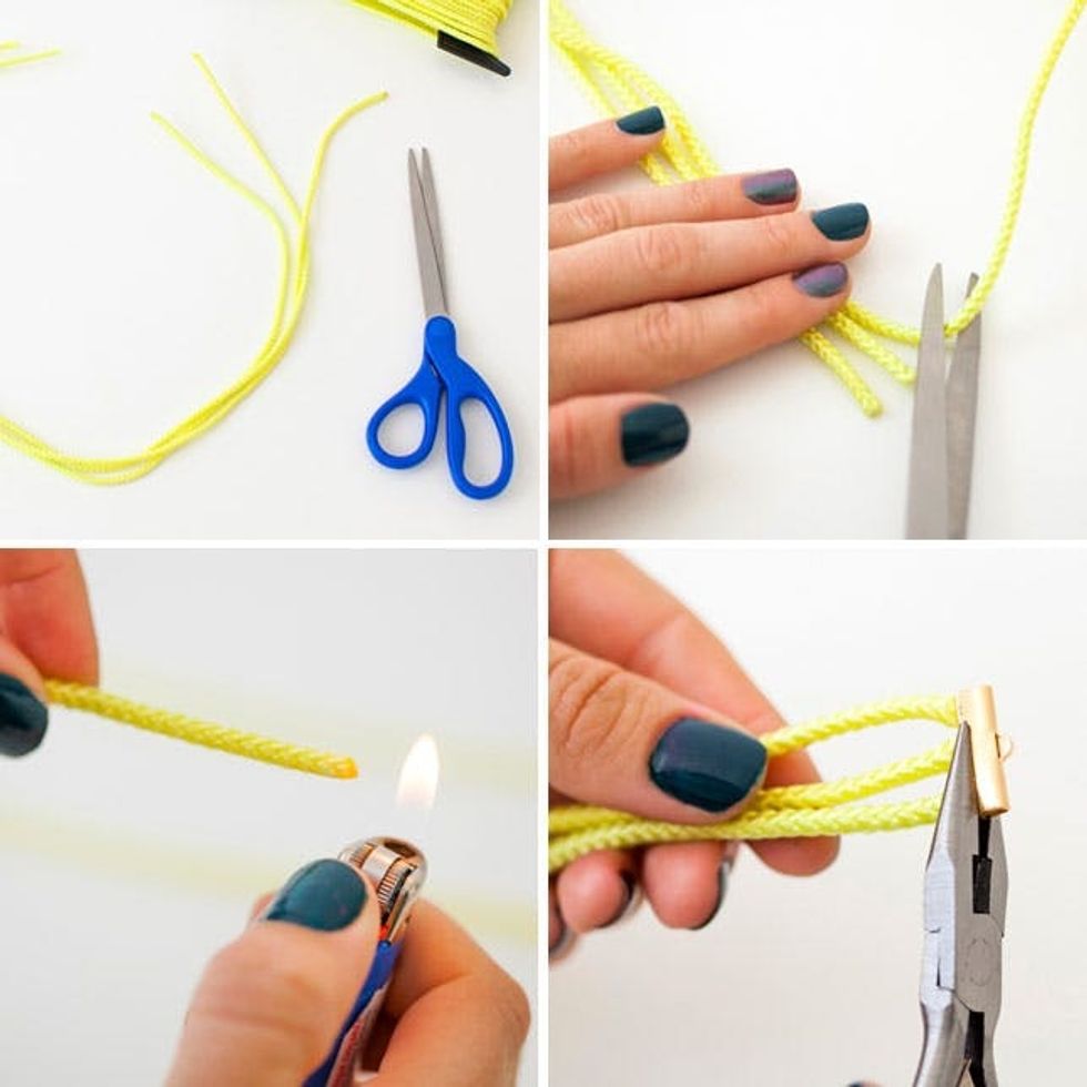 Cut three lengths of rope to about 18 inches long. Measure around yourself so you have a length that works for you. Use a lighter to seal the cut ends of the rope and press into a cord end.