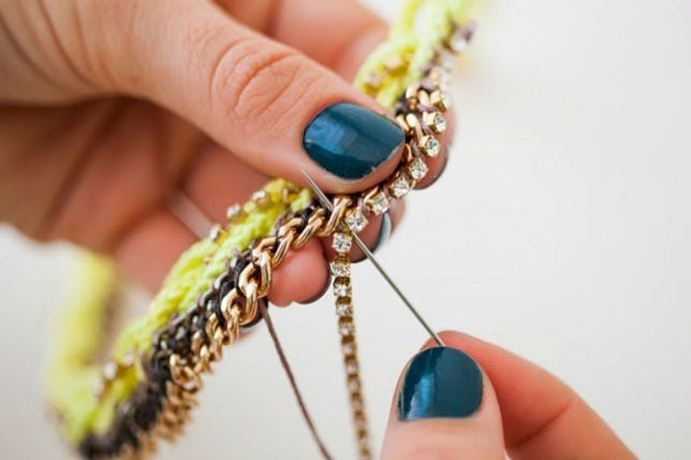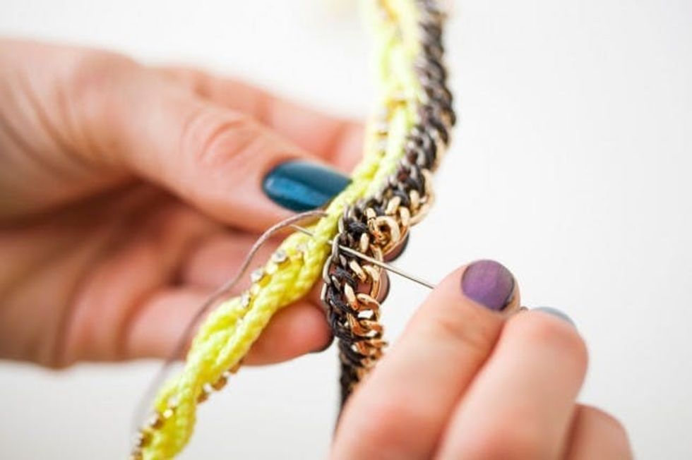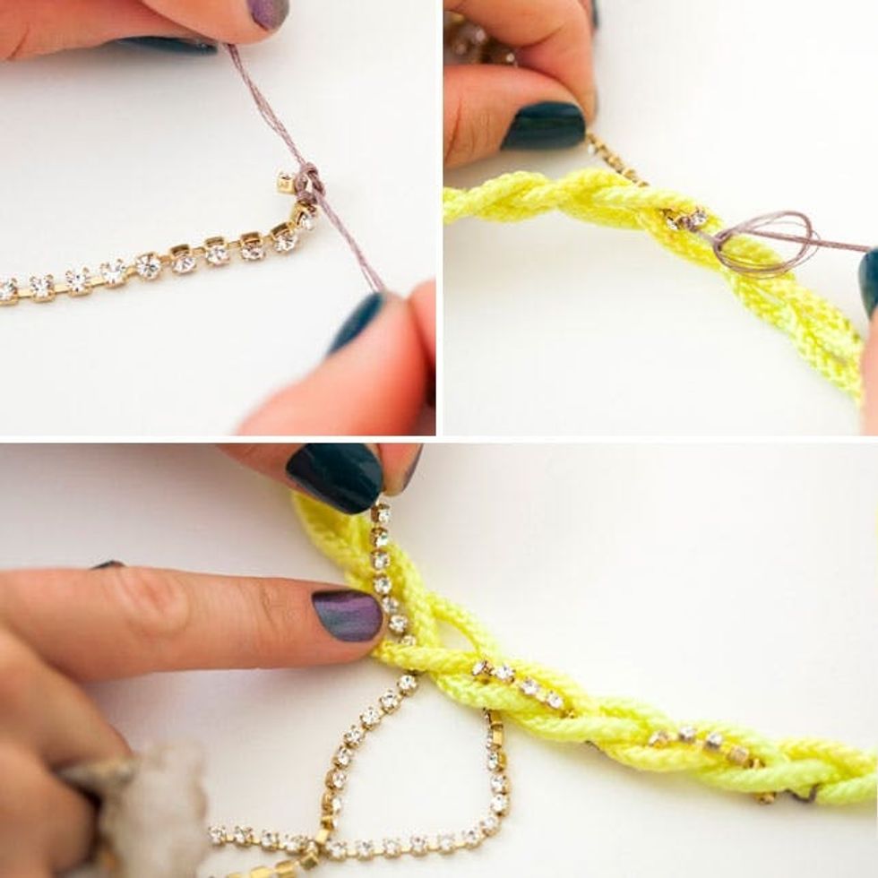 First, we weaved a length of rhinestone into the braided rope. Use embroidery floss on either end to tie the chain onto the rope.