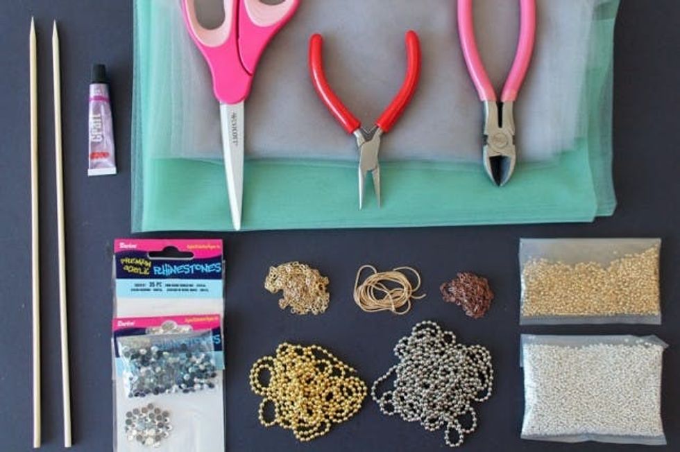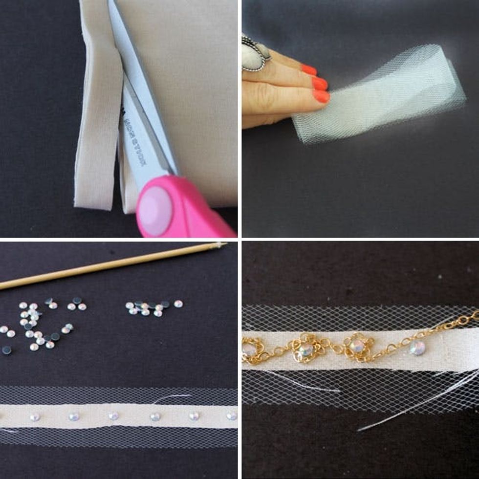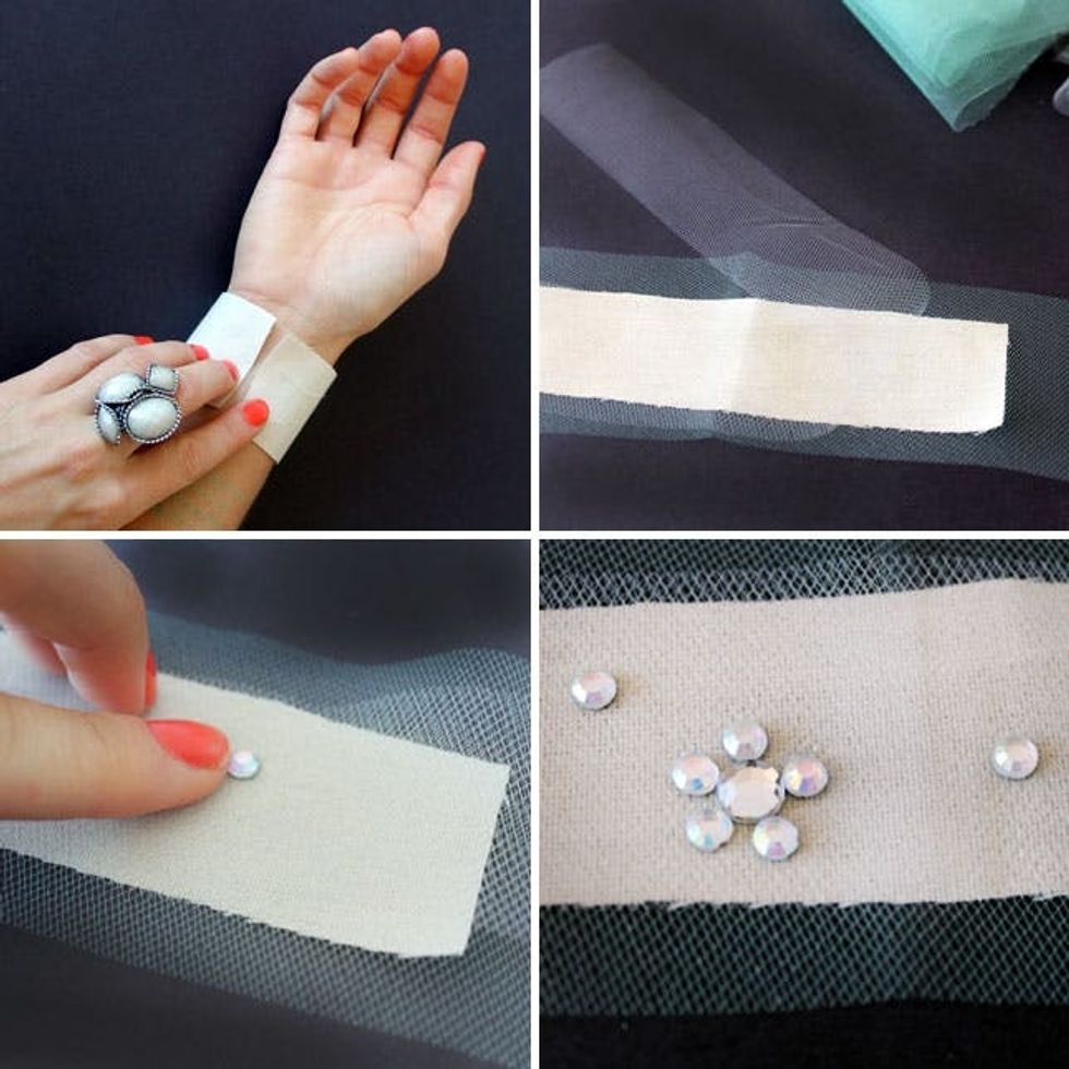 Measure a piece of muslin around your wrist. You could allow for an 1/8 inch between each end of the coff. Lay a piece of tulle over the cuff, as we did with the necklace. You want this piece of tulle to be about twice the length of the cuff base, as you’ll use the tulle to tie it around your wrist. Use glue to attach rhinestones sporadically on the cuff.