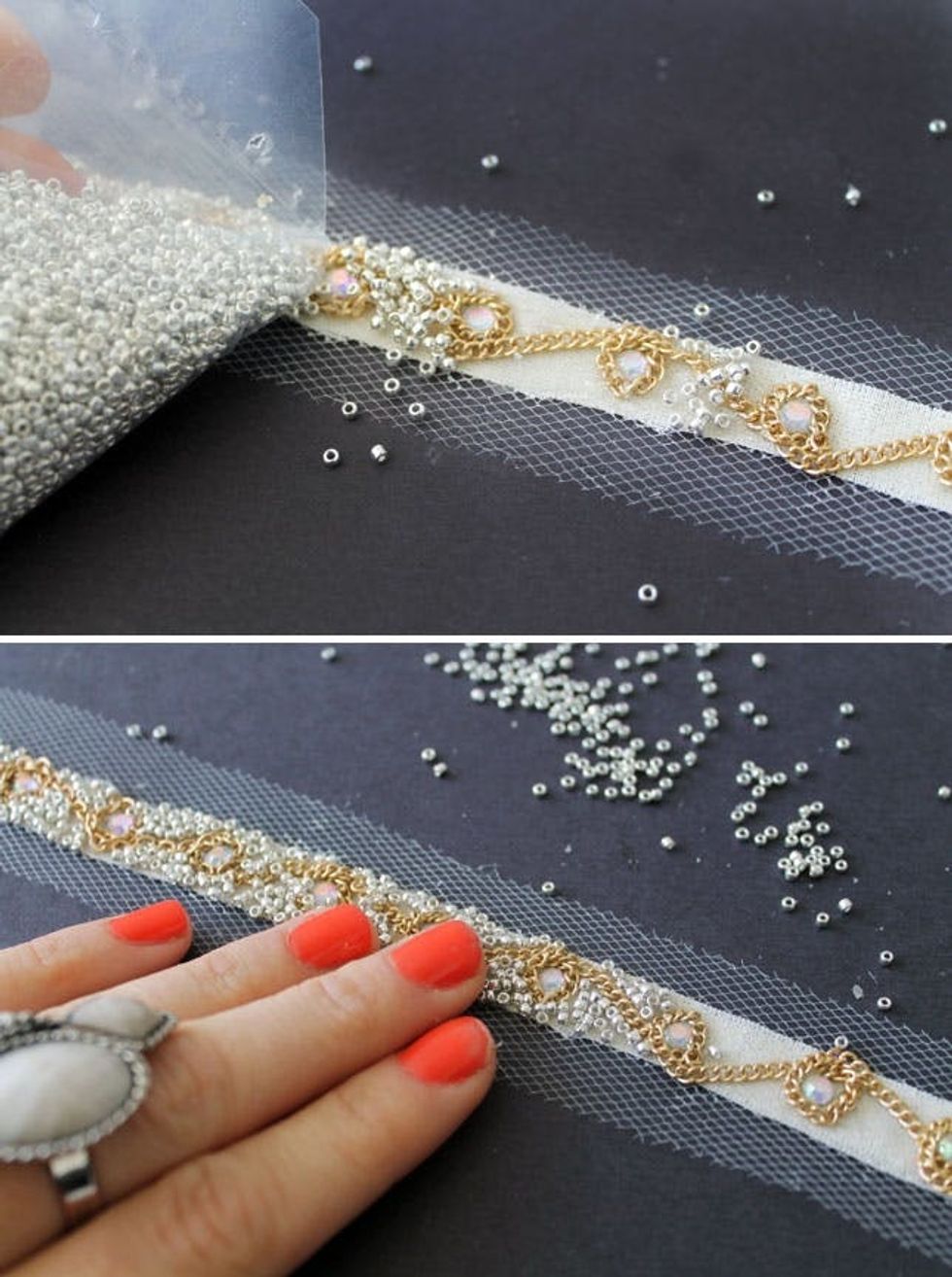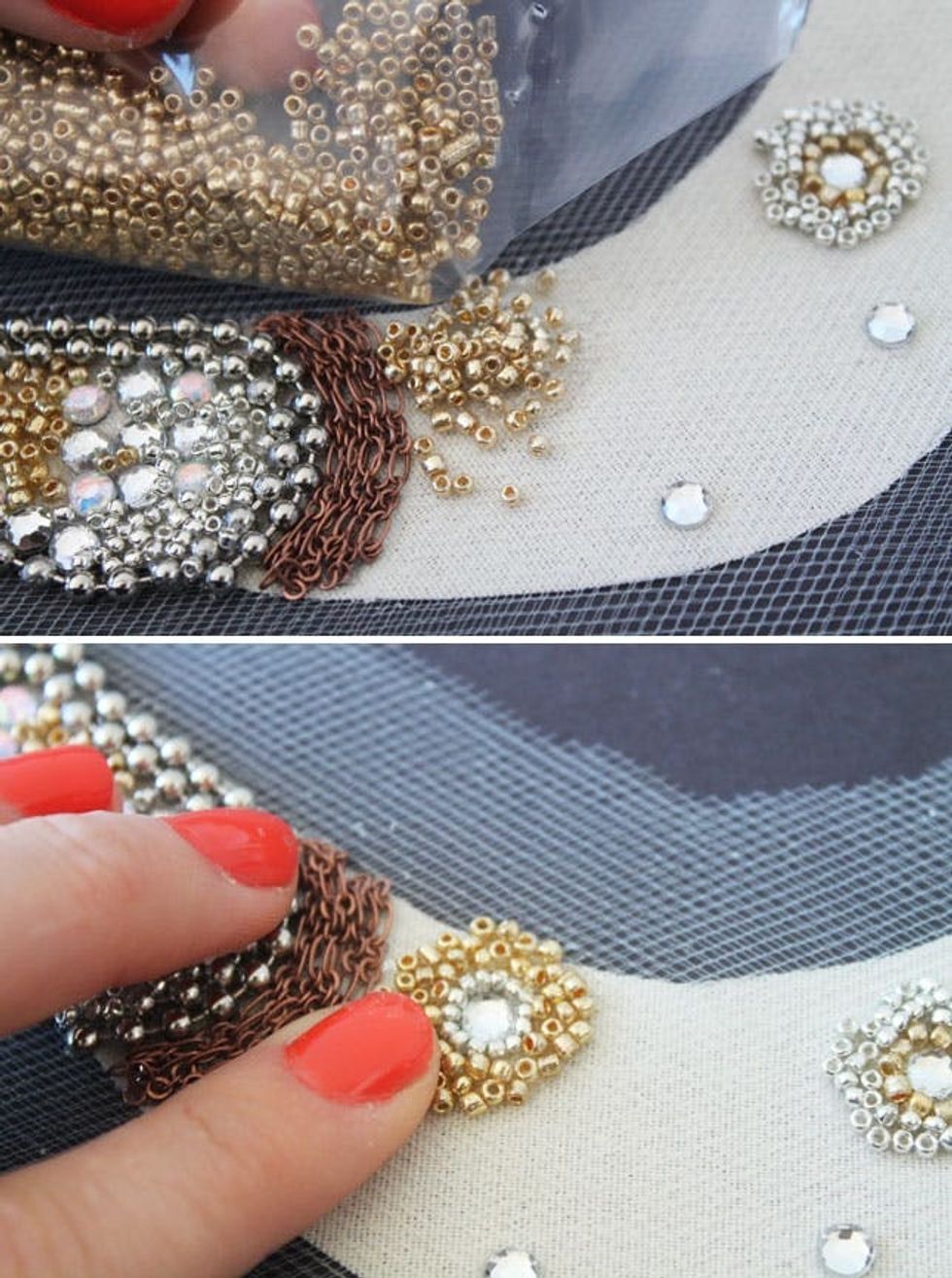 Surround rhinestones with chains and seed beads in any pattern you like. We went a bit more linear with this one, and left one stripe totally un-bedazzled.