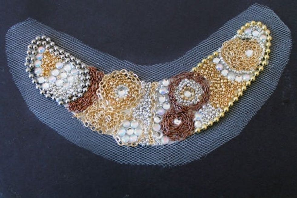 First, print out our necklace template and trace it onto your muslin. Cut out this shape, and cut out a piece of tulle around the same shape, but an inch larger on every side. Place the tulle over the muslin.