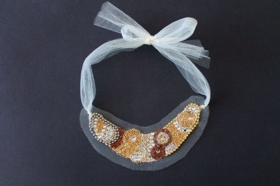 To add a clasp, we cut a piece of tulle about 2 inches wide and 10 inches long. Put glue on a 1-inch strip of muslin and wrap it around the end of your tulle strand. Do the same on the other side. Then glue the muslin onto the back of your necklace base. Tie the tulle in a knot at each edge of the necklace base.