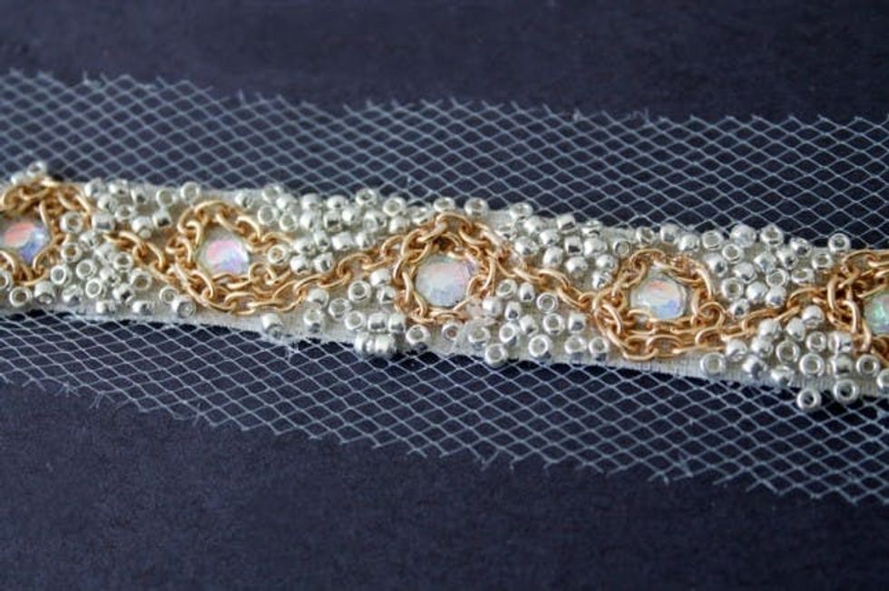 Last, we’ve gotta add a headband to the mix. Cut a piece of muslin about a 1/2 inch wide and 18 inches long. Do the same with tulle, but slightly wider and about 6 inches longer. Glue rhinestones on and spiral chain around each one.