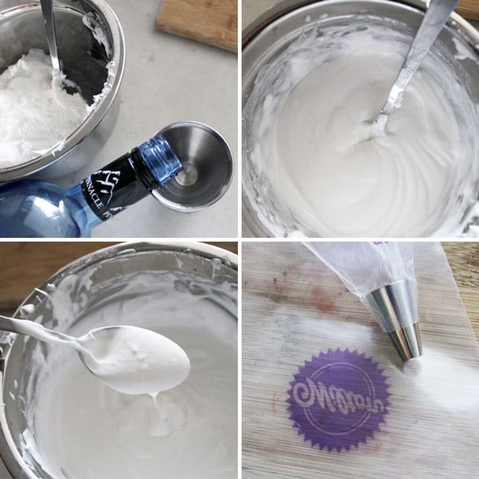 Place a can of frosting in a bowl. Add vodka 1 shot at a time. We ended up using about 6 oz (3 shots) but it totally depends on your frosting so add 1 shot at a time. Add powdered sugar 1 tablespoon at a time until your frosting has thickened up and is back to a normal frosting consistency. Pour into a piping bag.