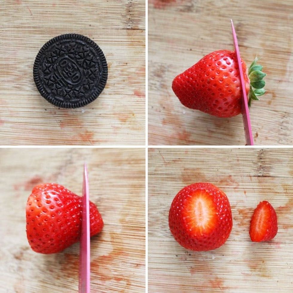 Now, to prep your santas. We used an oreo as black pants. All these bottomless santas we’ve been seeing online are downright risqué! Set an Oreo down on your cutting board. Cut the stem off one strawberry. Then cut off the top, which will be your hat.