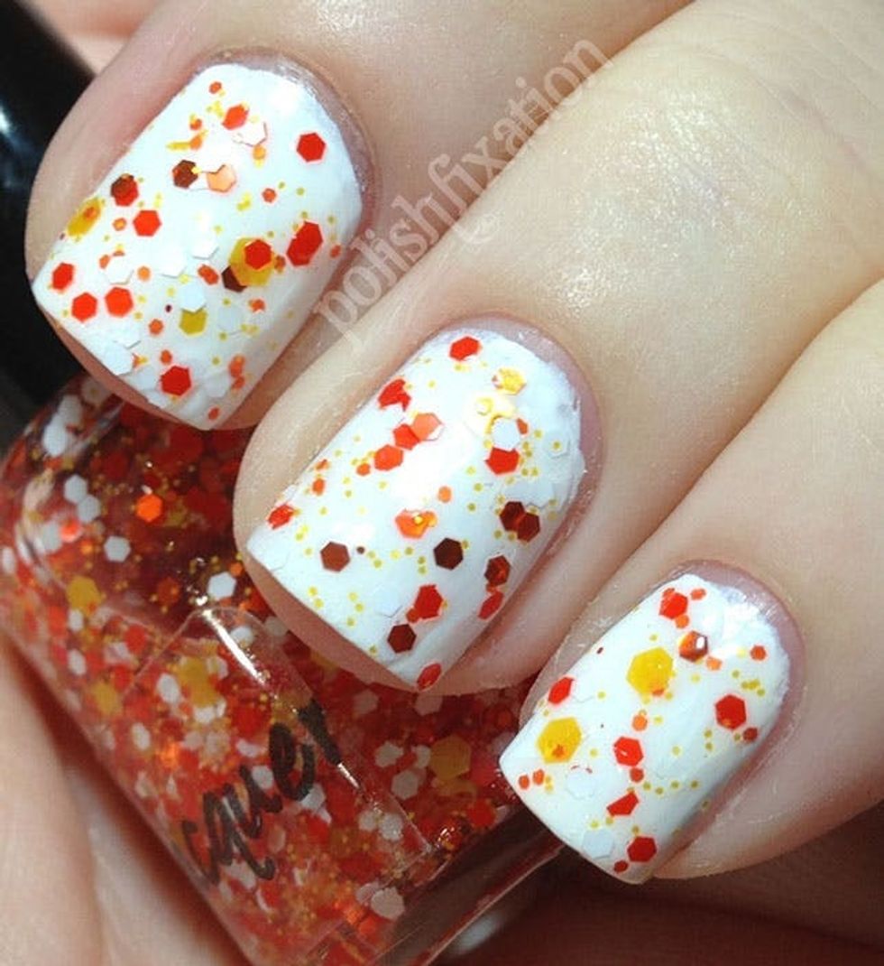 1. Pumpkin Hangover: This one is great for amateurs! Just paint your nails white, then add a coat of this confetti lacquer. Clean and sophisticated, yet fun.