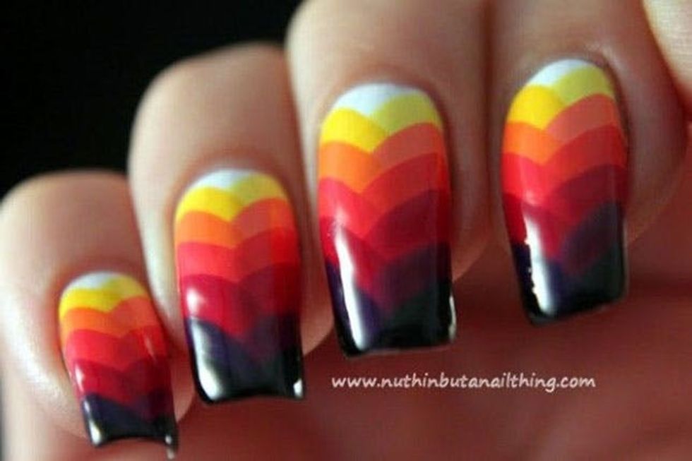 11. Fall Sunset: Another one that could work year round, but is especially fun for fall, we love this sunset design. Though ladies, let’s trim up those nails a bit, shall we?