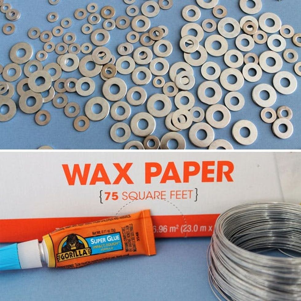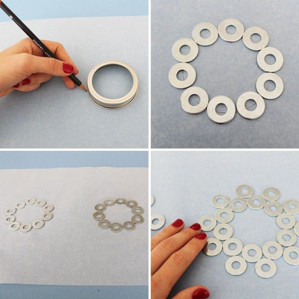 Lay out a piece of wax paper as your work surface. Use a can or jar to trace a circle. This will be your template. Lay out a circle of washers. Add a second round of washers on the outside, acting as snowflake points.