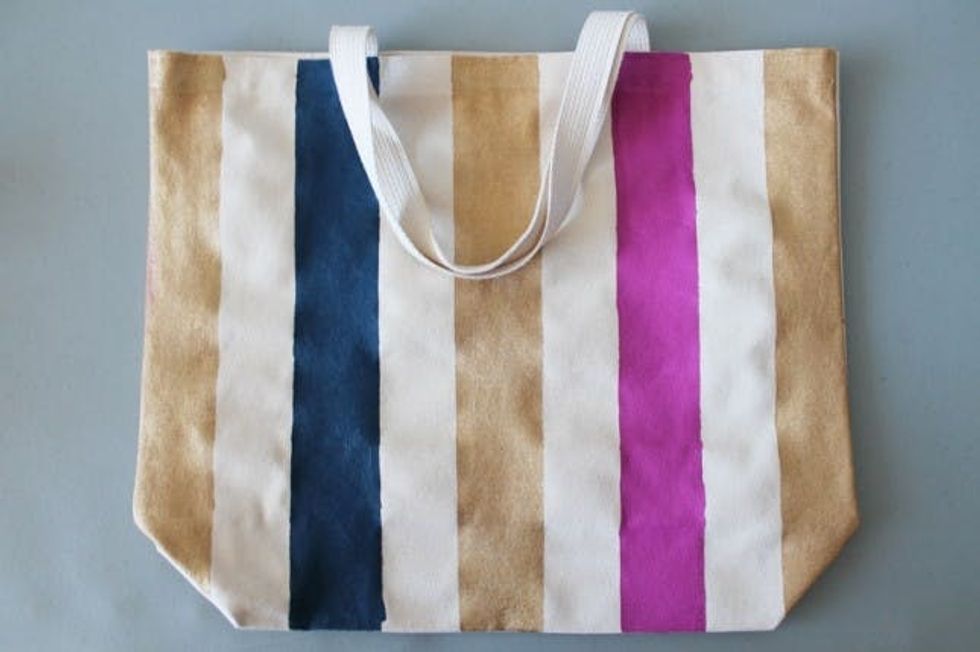 Create a pattern on your tote using tape. We went for simple vertical stripes with our first tote. Paint your colors in whatever color pattern you like. Let it dry and then peel off the tape.