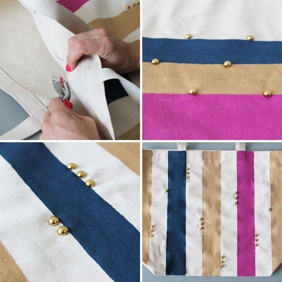 To add your studs, we recommend using a spoon to bend the studs through the tote. Again, do whatever pattern you like!