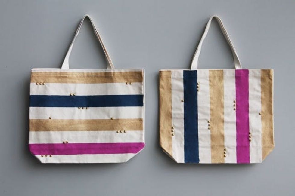 It’s totally totes week here at Brit HQ, and today we’re serving up an easy way to customize the quintessential canvas totes using nothing but fabric paint and gold studs. It’s the perfect bag for a last minute weekend getaway or Sunday picnic.