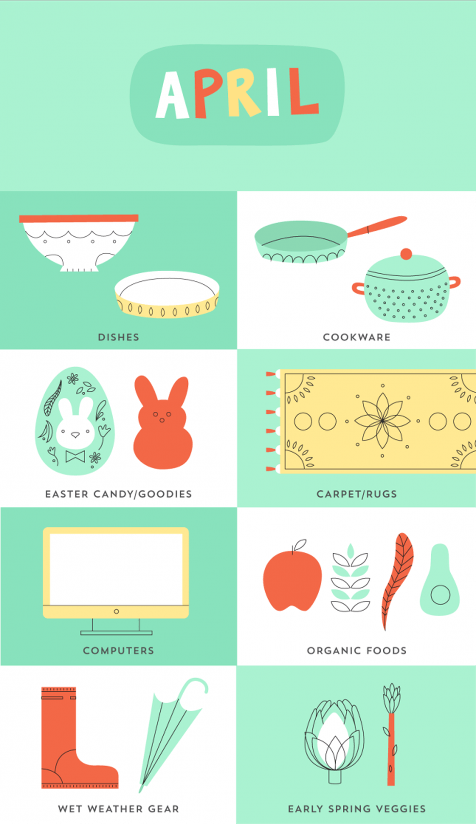 1. Dishes + Cookware: Retailers and housewares manufacturers know as well as the rest of us that April is the beginning of graduation, bridal shower, and summer wedding seasons. Because of this, they’re more likely to lower prices to make gifting more affordable. But who says you can’t treat yourself too!? This month is prime savings time for replacing your chipped dishes and rusty pans.