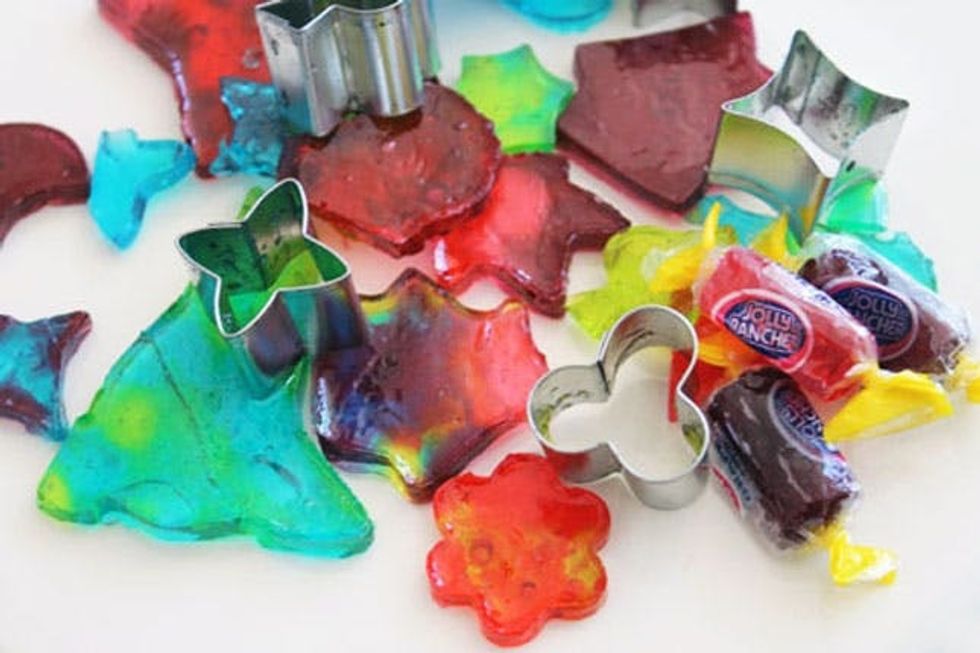 5. Colorful Hard Candy: Did you know you can melt Jolly Ranchers right in your oven? We’ve seen all sorts of fun versions of DIY lollipops using jollies (you called them that back in the day, didn’t you?), but we decided to create custom shapes with help from our trusty mini cookie cutters!