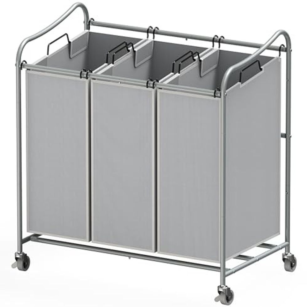 Upgrade your laundry routine with this three-bag hamper cart. It holds up to 40 pounds of laundry and features a sturdy steel frame with smooth-rolling wheels for easy mobility, making laundry day less of a chore.
