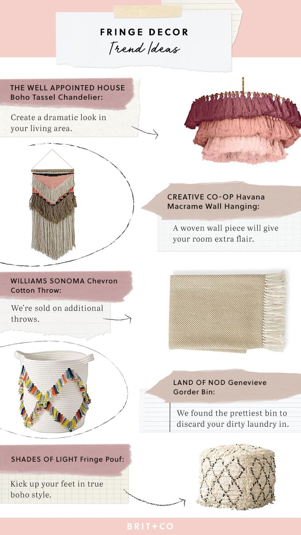 From top to bottom: The Well Appointed House Boho Tassel Chandelier ($194), Creative Co-op Havana Macrame Wall Hanging ($25), Williams Sonoma Chevron Cotton Throw ($104), Land of Nod Genevieve Gorder Bin ($49), Shades of Light Fringe Pouf ($139)