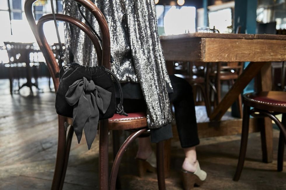 The Clare V. x PAIGE collection features just three limited-edition handbags — a selection that’s small, but mighty. The Camille Pouch is an updated version of Clare V.’s iconic iPhone pouch, offered in holiday-ready black velvet with a detachable crossbody strap.