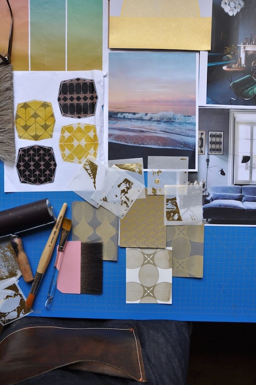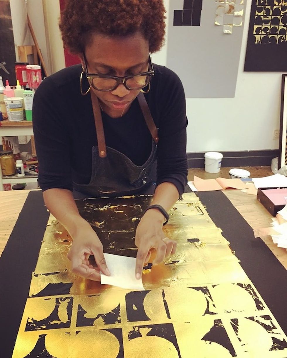 Hunt’s artwork is a beautiful mixture of Art Deco, screen printing, and gold leaf patterns. Her love of patterns stems from her childhood. As a shy kid, she spent a lot of time observing her surroundings. “I would isolate shapes in my environment and reorder and repeat them in my mind. It was like a game, and I found it soothing and it’s something that I still do to this day,” says Hunt.