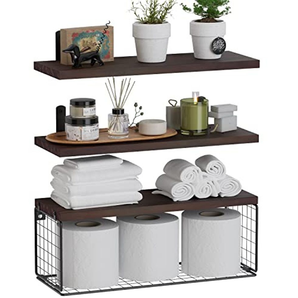 A cluttered home is a cluttered mind, and these rustic wall shelves are just the thing to clear up some of the mental load created by cluttered bathroom counters. With enough space for all of your bathroom essentials, you'll never be left wondering where you put your favorite lotion. The set includes two floating shelves and one unique-designed shelf that's perfect for storing toilet paper, so it's always within reach.