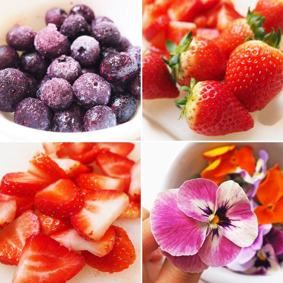 Wash edible flowers and fresh fruit, and if needed, slice up fruit. You can use any fruit you like, but I went with fresh strawberries and frozen blueberries.