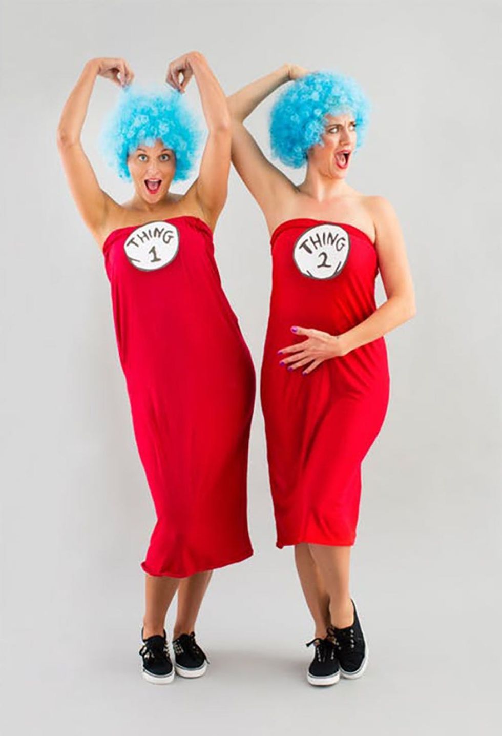 If you own a red maxi, pull it up and turn it into an ultra-simple dress. Pop on a wild wig, print out Thing 1 and 2 signs, and you and your bestie have an excuse to be extra-silly all night long.