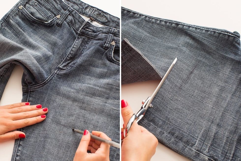 1. Try on your jeans and mark where you want your shorts to end. Fold the jeans in half and cut about 1 inch under your mark.