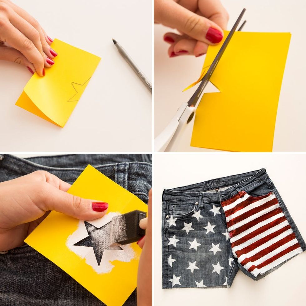 Use the paper to create a star stencil. Fold the paper in half and draw half of a star. Cut out and place on your shorts. Use the foam brush to apply the paint.