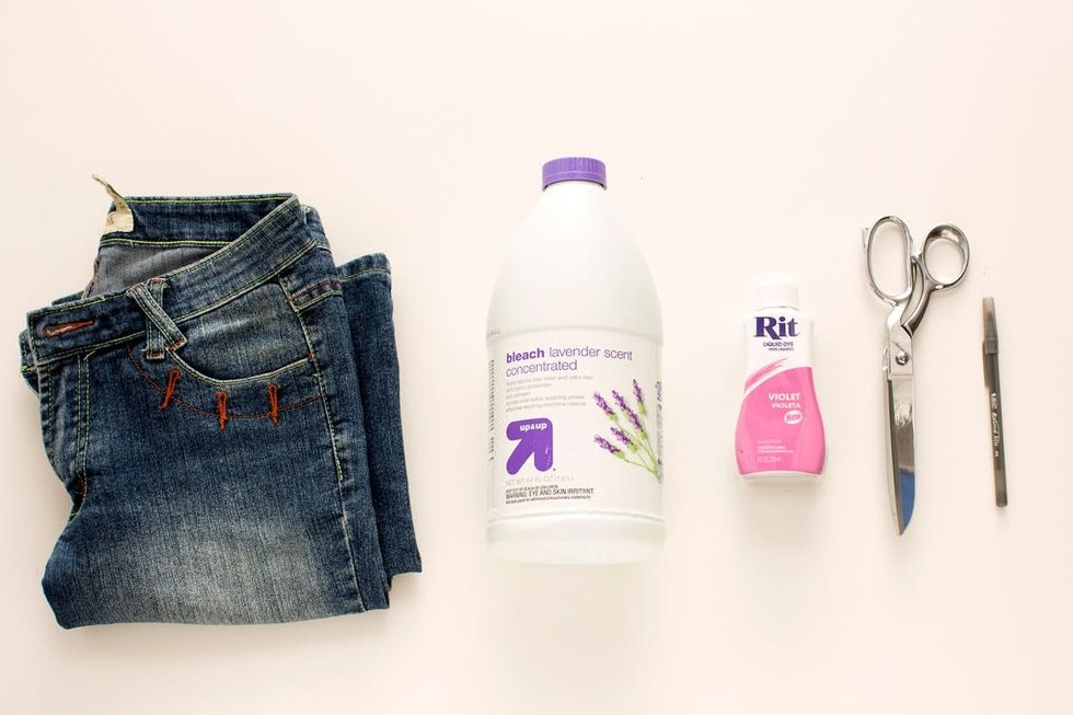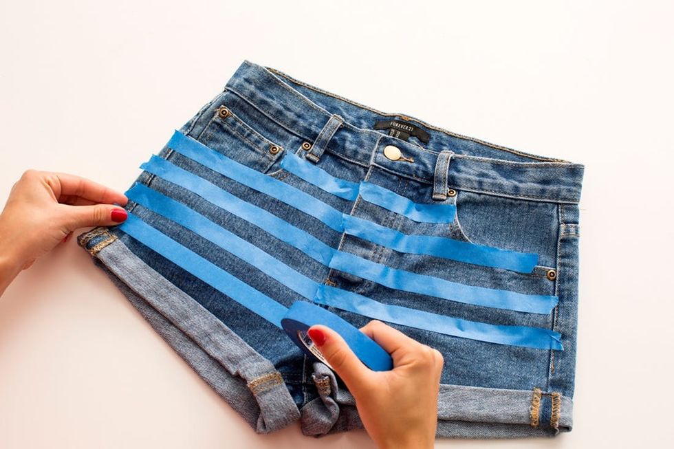 Just like the American Flag shorts, try these jeans on to find the perfect length for your shorts. Cut one inch below your line because you can always cut more, you can’t add on what you’ve already cut. Next, create a mixture that is half water, half bleach. Let your shorts soak for about an hour. Completely immerse the shorts in the bleach, you don’t want to have uneven spots. Once they’ve soaked, rinse the shorts and let them completely dry.