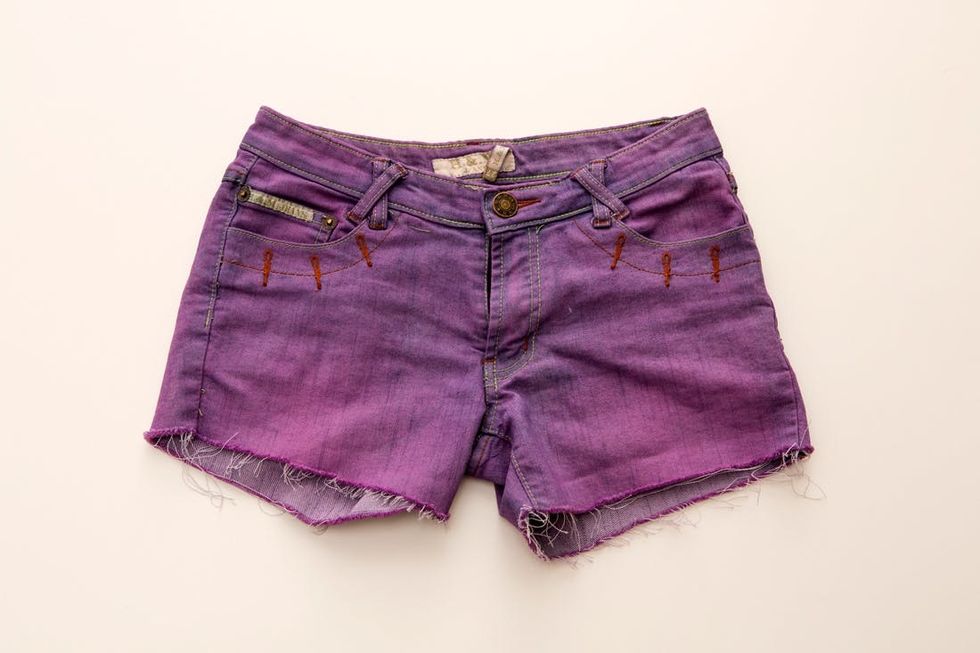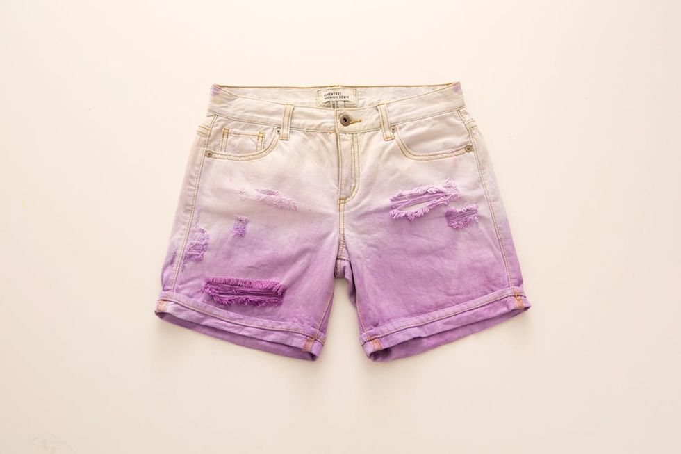 Time to turn these cut-offs a nice Radiant Orchid. Create a mixture of water and dye. You don’t need too much dye, just enough to get the water a solid rich color. Soak the shorts in the dye for about an hour. Once again make sure all spots are covered so you don’t have any weird spots. Once they’ve soaked up enough color, rinse them out and put them in the washing machine. Wash these alone because they will bleed and mess up your other clothes!