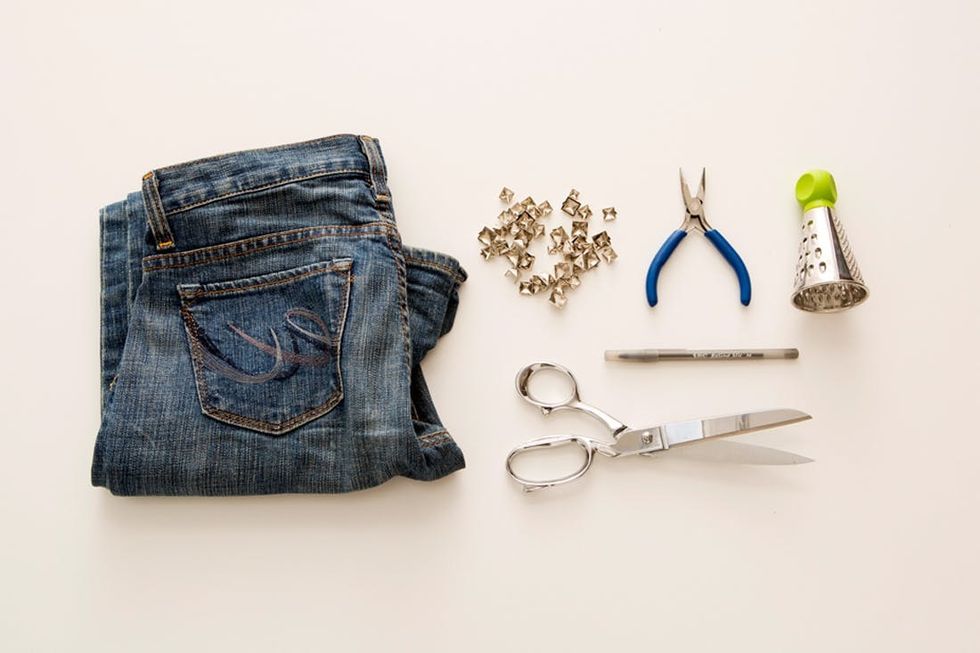 Lay your studs out in a pattern before you start studding. This will help you with spacing so you don’t make unnecessary holes. Once you’ve got them in place, poke them through the jeans and, using the pliers, bend the back handles down.