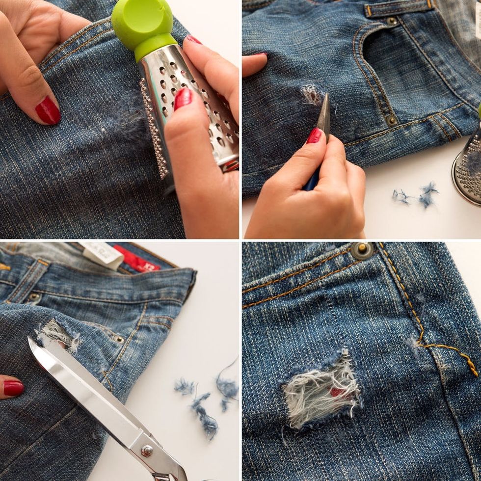 2. Use the cheese grater to distress your jeans. You will want to leave the white weaving behind and pull the denim weaving with pliers.