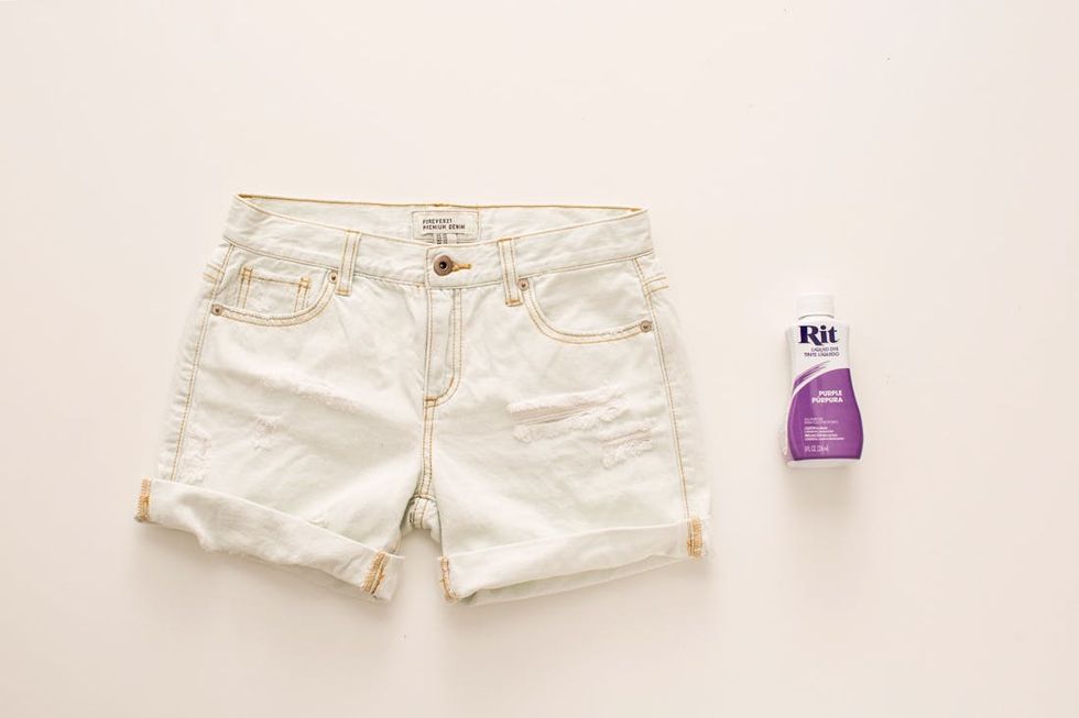 1. Mix ⅘ water with ⅕ fabric dye. Dip shorts in dye ⅔ of the way.