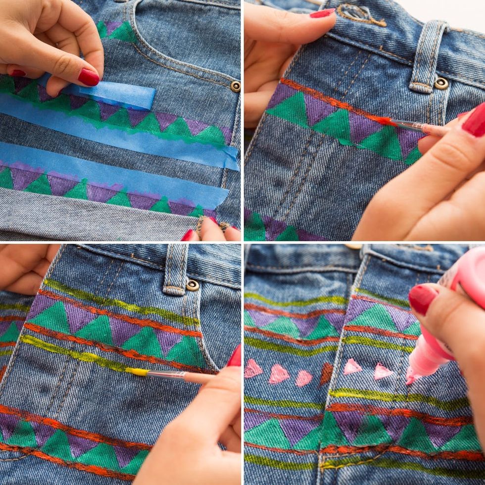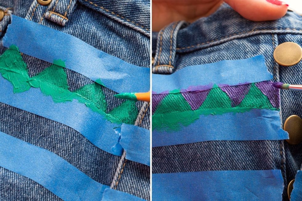 Peel back the tape and add some colorful lines. Then grab some puff paint and add triangles that face opposite directions.