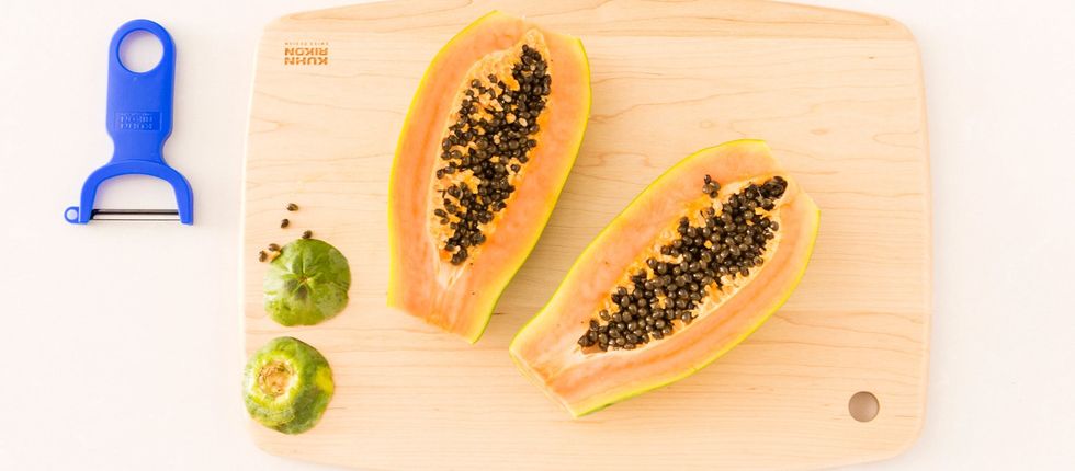 1. Pull out a clean cutting board, preferably one that you only use for fruit (so it doesn't taste like garlic or onion). Take out your largest, sharpest chef's knife as well as a vegetable peeler (Kuhn Rikon is my fave, and it's only $5). Rinse the papaya, scrubbing off any dirt.