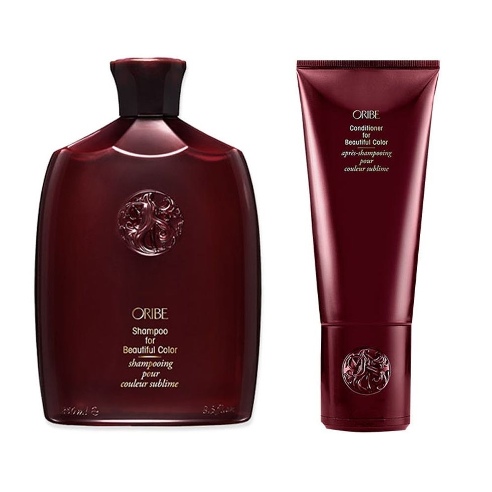 2. Invest in color-safe shampoo and conditioner. “A high-quality shampoo and conditioner that actively protects your color is so key,” says Bushey. When choosing a color-safe shampoo and conditioner, make sure that the product is sulfate-free so it won’t strip your gorgeous hue. A duo like the Oribe Shampoo for Beautiful Color ($44) and Oribe Conditioner for Beautiful Color ($46) is a solid set that will keep your pigmented locks looking freshly dyed.