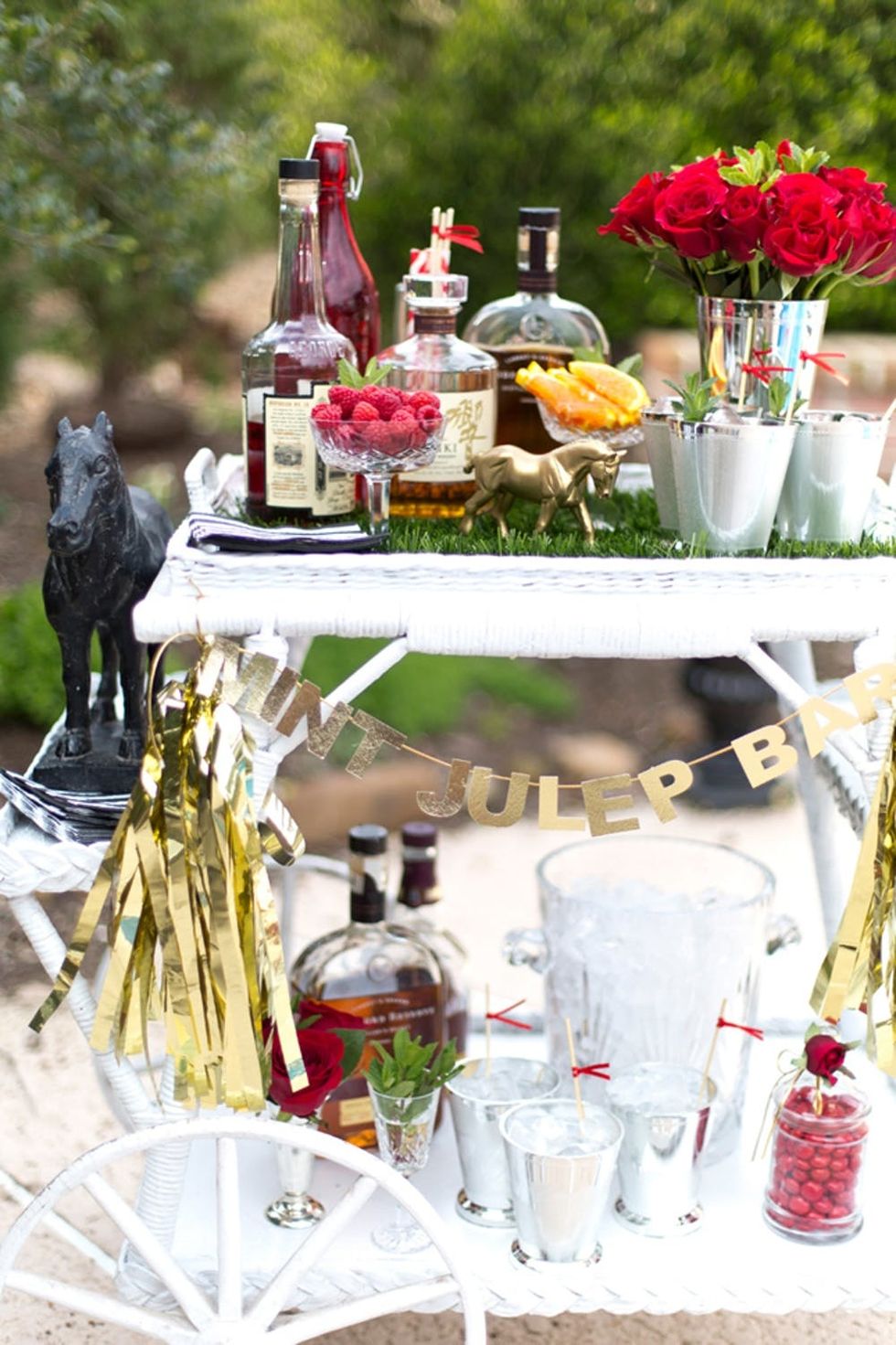 1. Deck out your bar cart with the best bourbons. Pick out a few new varieties (ask your local shop for recommendations), then layer on the classic silver cups, some ice, some garnishes, and maybe even a horse statuette or two. (via Pizzazzerie)