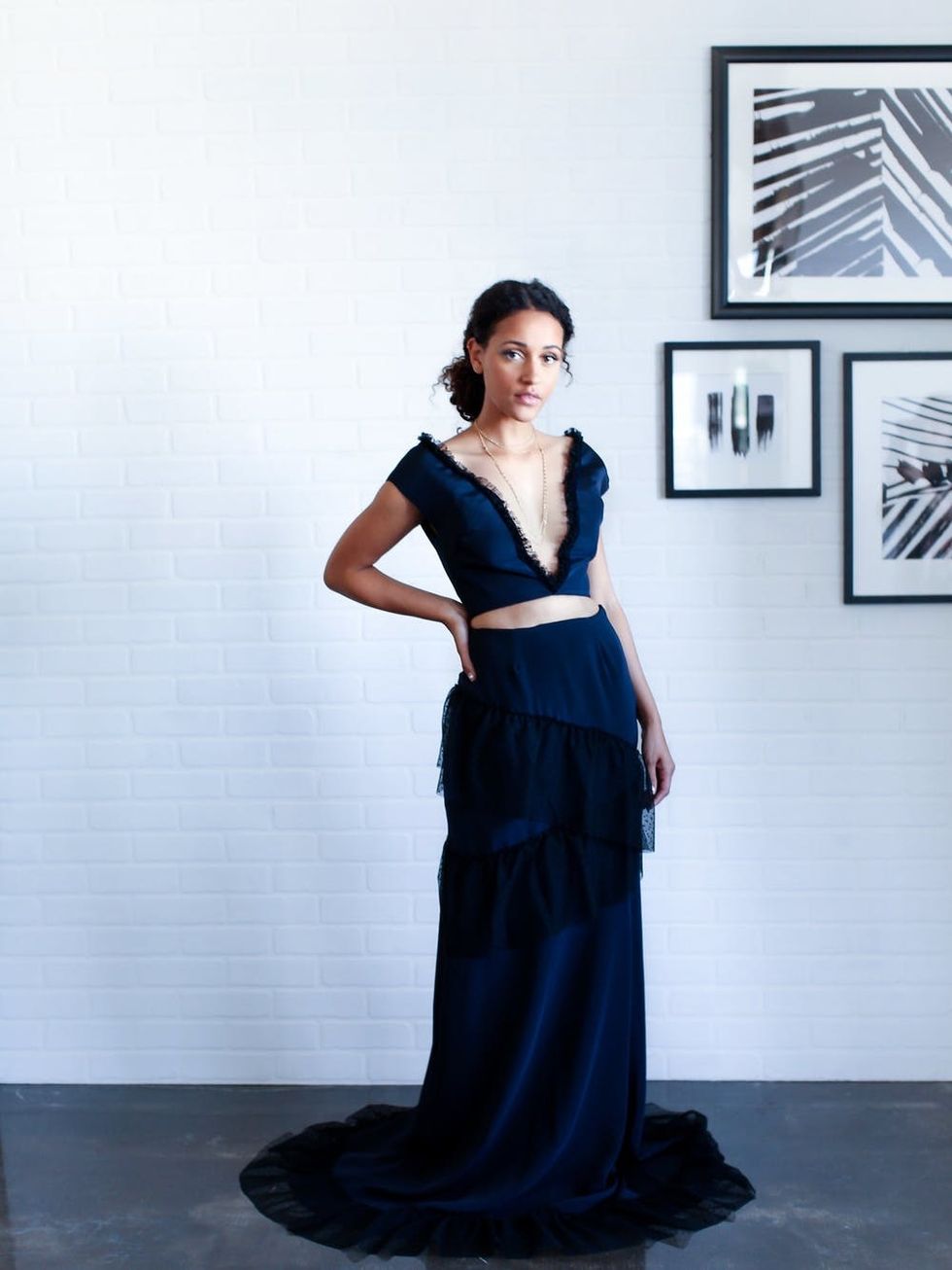 1. Twilight ($1,190): *Jaw drops.* Channel pure romance in this midnight blue silk crepe co-ord featuring a deep-V and a sweeping skirt.